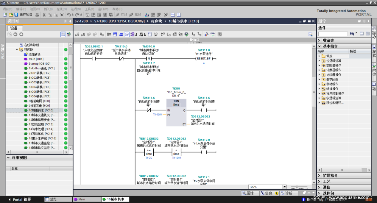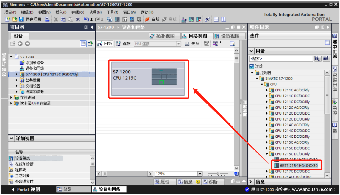 在TIA Portal组态软件中,创建一个新项目。然后进入“项目视图”对S7-1200进行硬件组态。在CPU属性窗口,修改控制器名称(S7-1200)和设置IP地址,并在“设备视图”窗口中,继续添加IO模块。