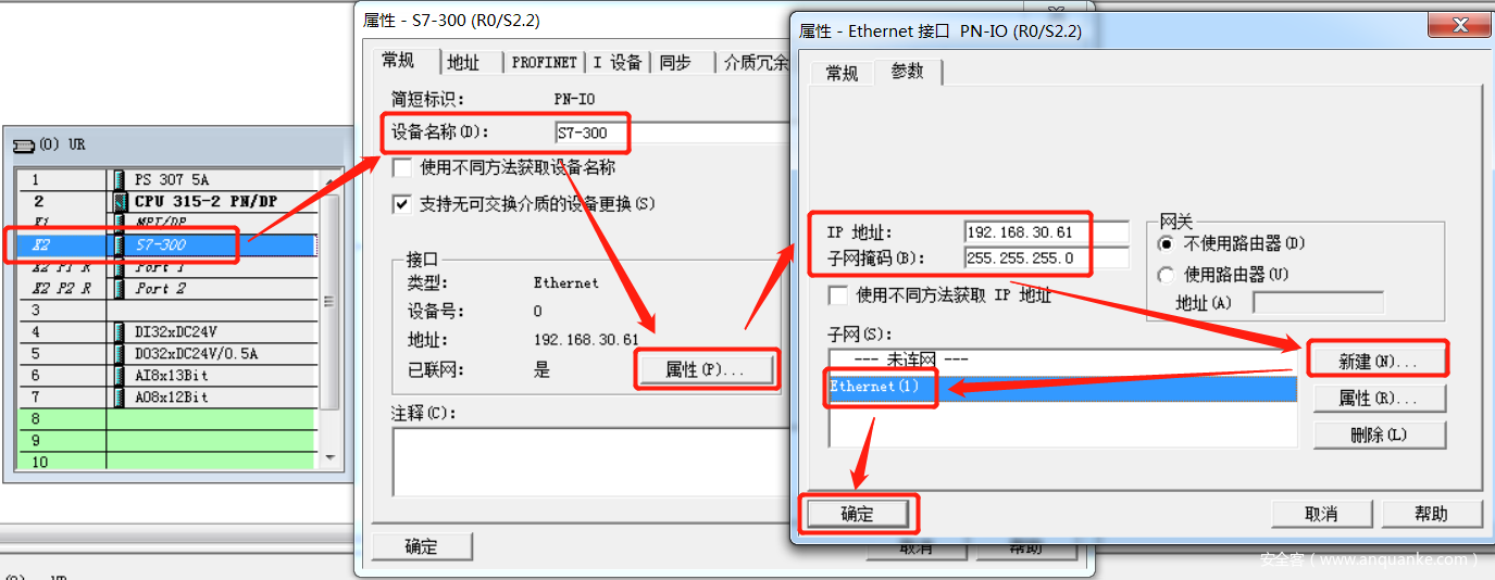 使用STEP7 V5.6创建一个新项目,并在硬件组态界面中组态315-2 PN/DP,设置IP地址,并确认设备名称。注意要与S7-1200 CPU的IP地址在同一个网段,且地址不能重复。
