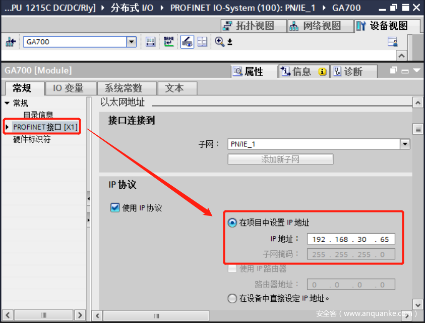 在GA700变频器属性窗口中,修改IP地址。注意要与S7-1200 CPU的IP地址在同一个网段,且地址不能重复。