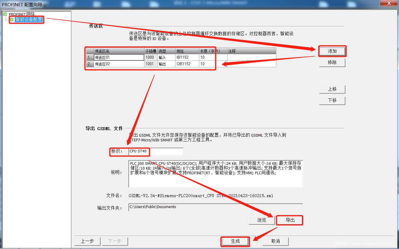 S7-200SMART CPU也设置为I-Device,建立两个传输区,并导出S7-200SMART CPU的GSD文件: