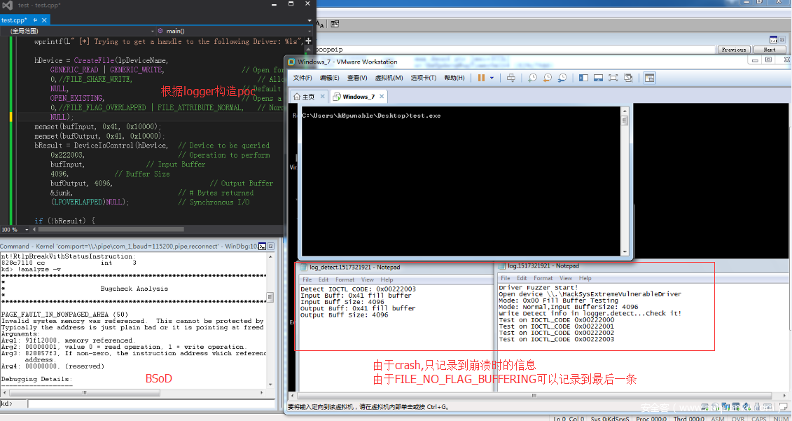 主要问题在于正常的文件写入是会先把写入内容放在一个cache里,写满了再往文件中写,这个主要好像是跟扇区对齐相关,但我们fuzz的时候会产生bsod,整个操作系统都会挂起进入异常处理,这时候缓存内容还没写到文件里,我们就记录不到发生bsod时的漏洞情况。