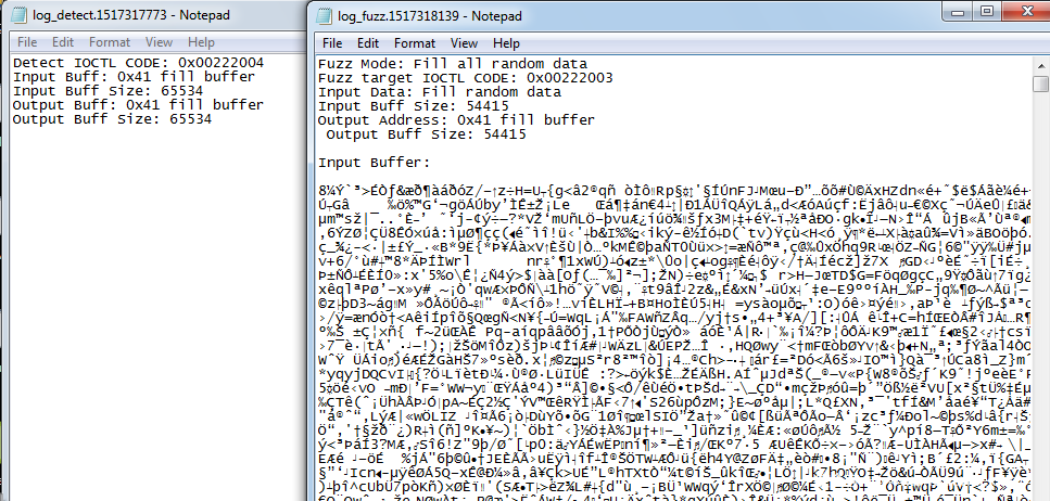 第三个问题,我在探测日志和fuzz日志记录的时候只记录了当前fuzz的内容,也就是当前ioctl code的,当前输入参数的内容,过往的都覆盖掉了,因为我尝试过在文件末尾写入,但是由于FILE_FLAG_NO_BUFFERING,本来写入的内容就比字符串多得多,还有很多for循环,稍微写一会就上G的文件了,除非硬盘够大。这样做就导致了一个问题,比如漏洞是由两个ioctl code产生的(同一个ioctl code两次调用倒不怕,也能fuzz出来,这个我遇到过),比如UAF,double free等等,那么就不利于bsod后的分析,和poc的还原,也能分析出来,但影响速度。