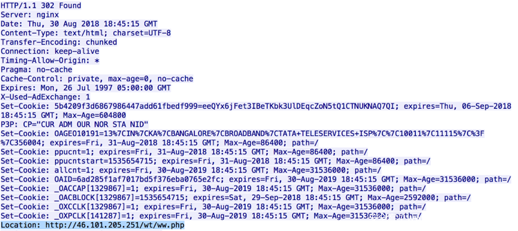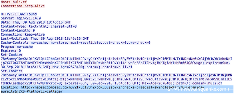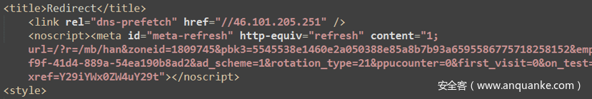 在前面没有提及到,其实‘link rel =“dns-prefetch”href“’标签的值是不同的,并且广告不会指向Exploit Kit。302跳转的完整重定向链如图3,4和5所示