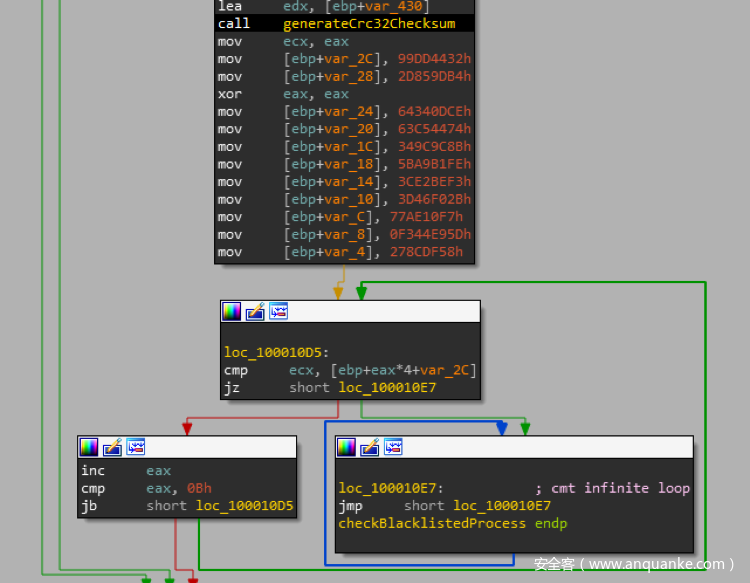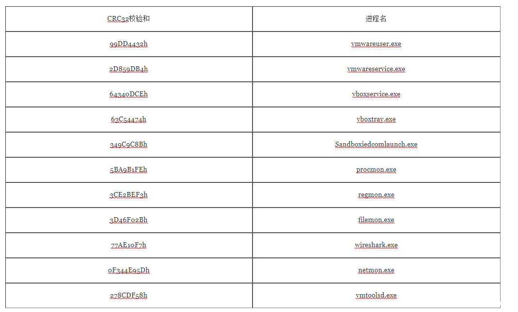 然后它枚举所有正在运行的进程,创建它们的crc32校验和,并将它们与列入黑名单的校验和进行匹配。表1为校验和列表及其相应的进程名称。