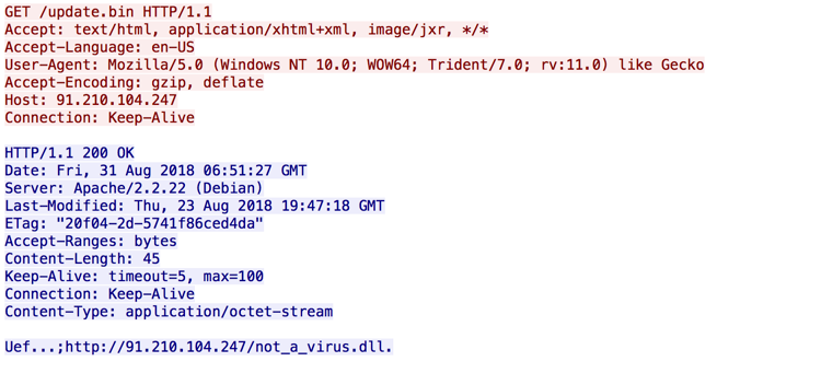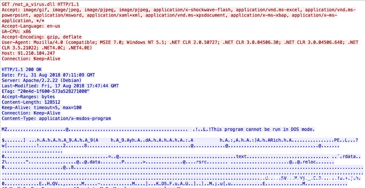 请求序列执行后,使恶意软件将提取GandCrab勒索软件并将其加载到内存中。图21和图22分别为request#1和request#2,下载并执行了GandCrab勒索软件(8dbaf2fda5d19bab0d7c1866e0664035)。