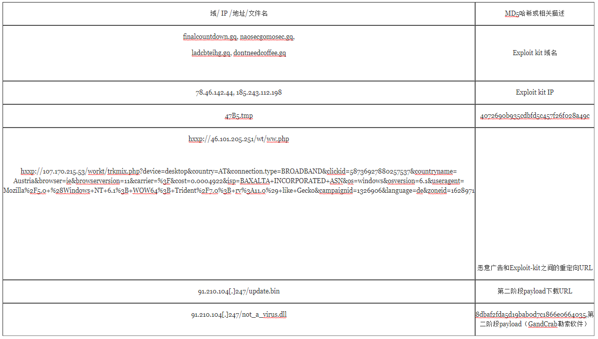 2018年8月24日,在域名finalcountdown [。] gq上第一次观察到该活动。8月29日,东京研究员“nao_sec”确定了此活动的一个实例,并在博文中将漏洞利用工具包称为Fallout Exploit Kit(https://www.nao-sec.org/2018/09/hello-fallout-exploit-kit.html)。在我们的研究中,发现了与恶意广告相关的其他域名,地区和payload。不同于nao_sec在博文中提到SmokeLoader银行木马在日本分布,我们观察到GandCrab勒索软件在中东分布,在这篇博文中我们将重点关注。