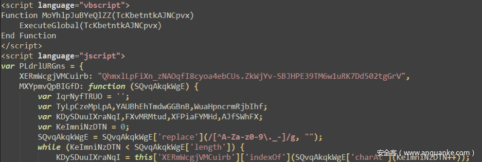 在登录页面的’<span>’标签中,用Base64对VBScript代码进行了编码。登陆页面加载时加载JS函数,JS函数解码下一阶段VBScript代码并使用VBScript ExecuteGlobal函数执行VB代码。