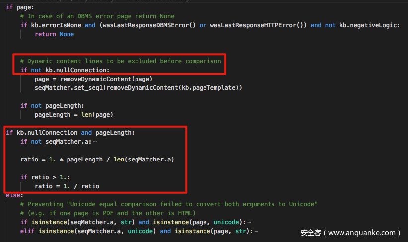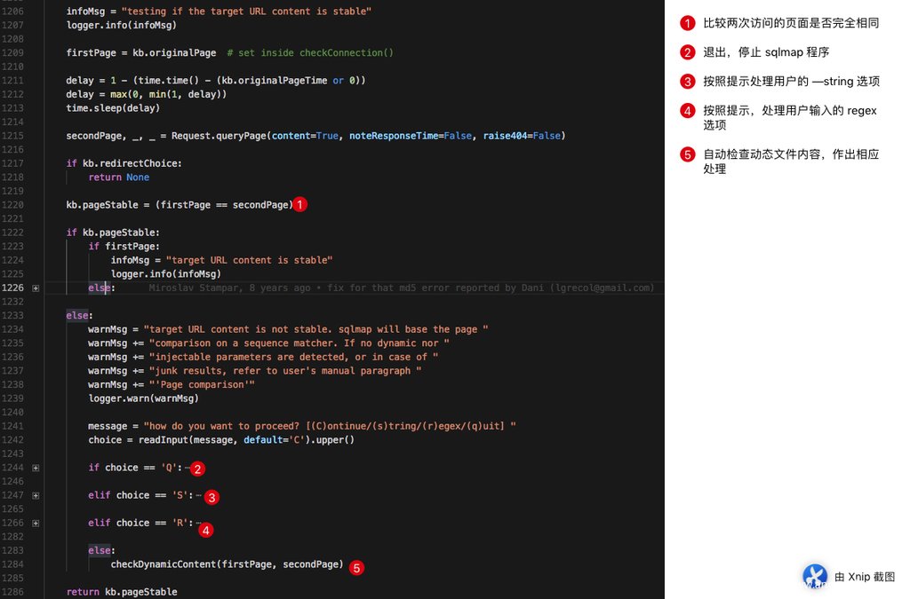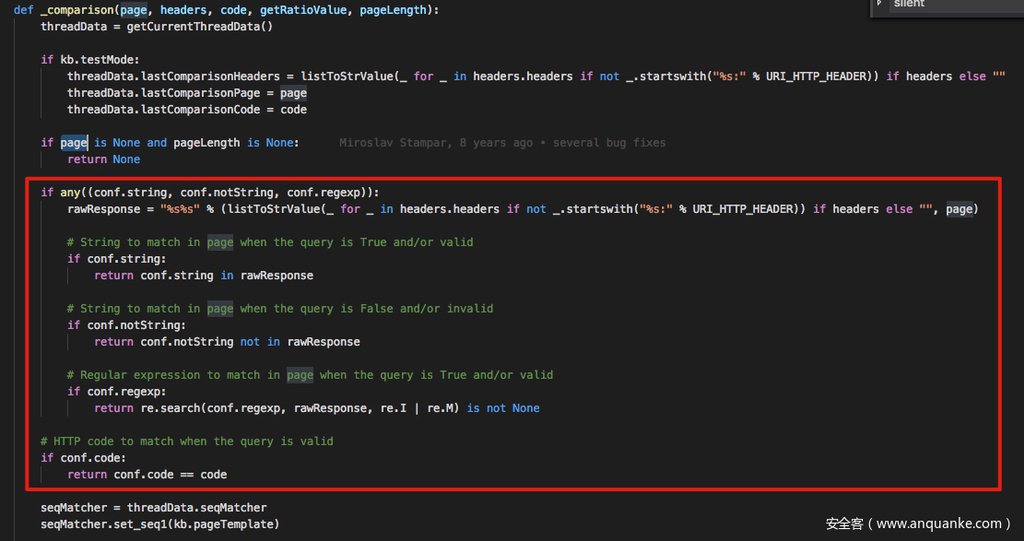 我们发现,实际的 sqlmap 源码确实是按照我们介绍的内容处理的,如果页面内容是动态的话,则会提示用户处理字符串或者增加正则表达式来验证页面。