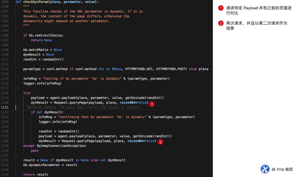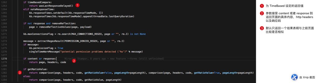 在标注中,我们发现了我们之前的疑问,为什么 agent.queryPage 时而返回页面内容,时而返回页面与模版页面的比较结果。其实在于如果 content/response 被设置为 True 的时候,则会返回页面具体内容,headers,以及响应码;如果 timeBasedCompare 被设定的时候,返回是否发生了延迟;默认情况返回与模版页面的比较结果。