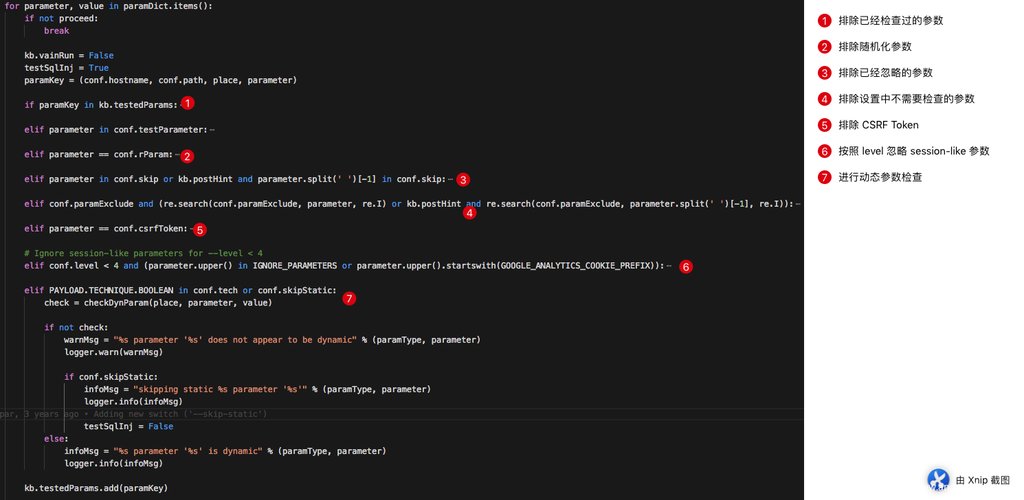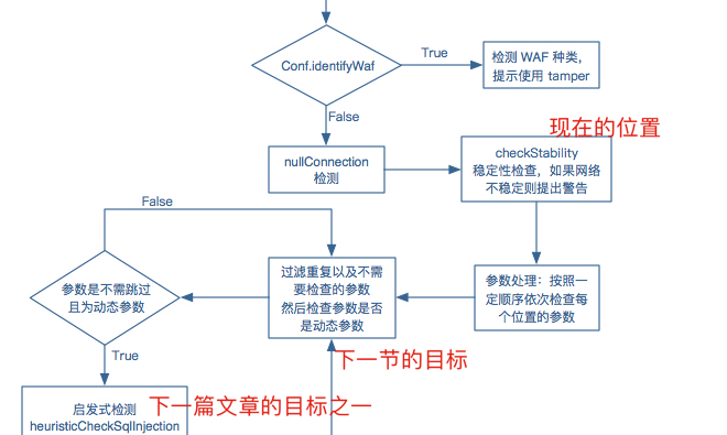 好的,接下来我们的目标就是图中描述的部分“过滤重复以及不需要检查的参数,然后检查参数是为动态参数”,在下一篇文章中,我们将会详细介绍 sqlmap 其他的核心函数,诸如启发式检测,和 sql 注入检测核心函数。