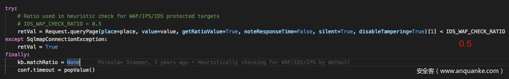 现在设定 IDS_WAF_CHECK_RATIO = 0.5 表明,只要打了检测 IDS/WAF 的 Payload 的页面结果与模版页面结果文本页面经过一定处理,最后比较出相似度相差 0.5 就可以认为触发了 IDS/WAF。