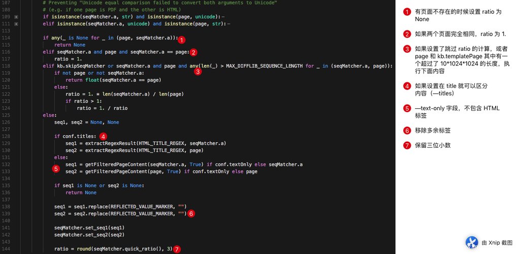 根据图中的使用红色方框框住的代码,我们很容易就能发现,这其实是在禁用 PageRatio 的页面相似度算法,而是因为用户设定了 --string/--not-string/--regex/--code 从而可以明确从其他方面区分出页面为什么不同。当然,我们的重点并不是他,而是计算 ratio 并且使用 ratio得出页面相似的具体逻辑。