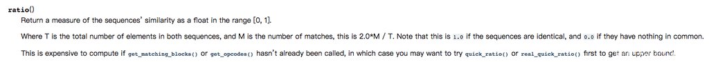 简单来说这个类使用了 Ratcliff 和 Obershelp 提供的算法,匹配最长相同的字符串,设定无关字符(junk)。在实际使用中,他们应用最多的方法应该就是 ratio()。