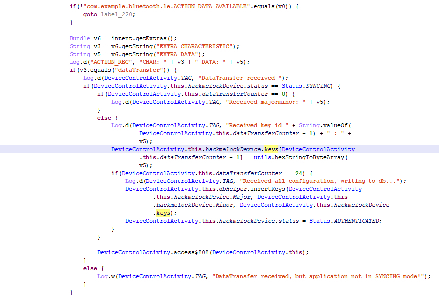 最开始按照正常的加密逻辑,向0x000c handler写入response总是认证不通过,对比在app上操作的控制台输出,发现其在计算出的response后多加了一个00,幡然醒悟最后一个写入的字符就是用来指示keyID的。而在服务端代码中,其不仅加载了初始化时传递的23个key,还以00扩展至128个: