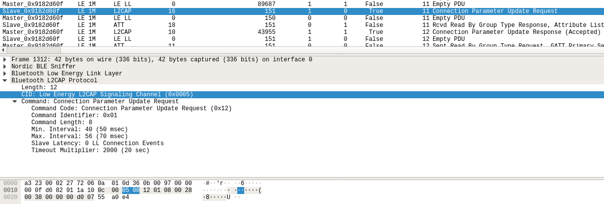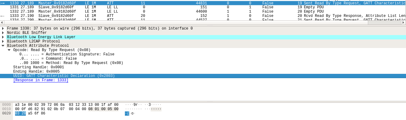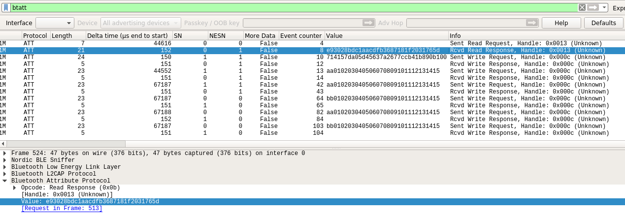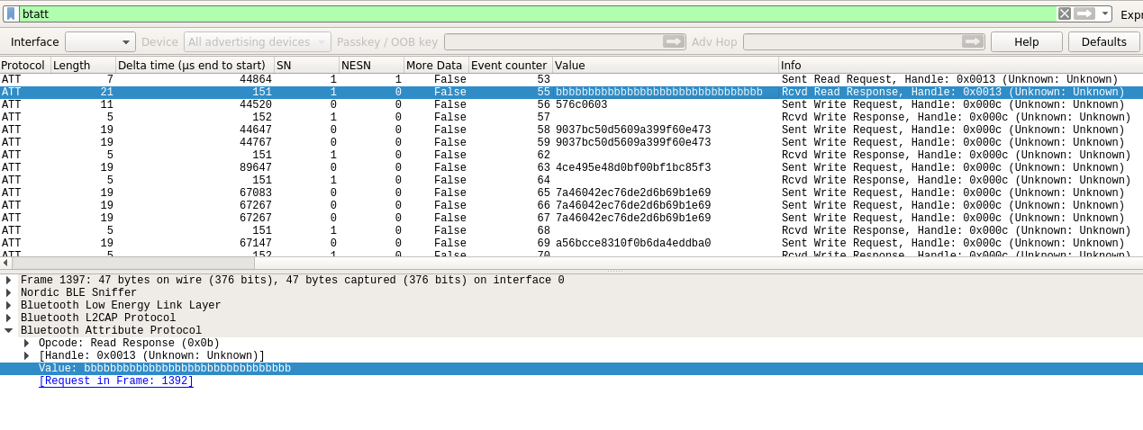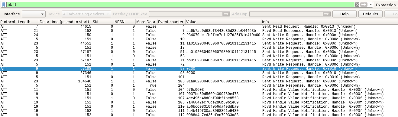 在数据包上的表现就是先对从设备的0x0013 handler进行读取请求,得到响应值后开始对0x000c handler进行一系列的写入请求,一共写入了24个序列完成初始化阶段: