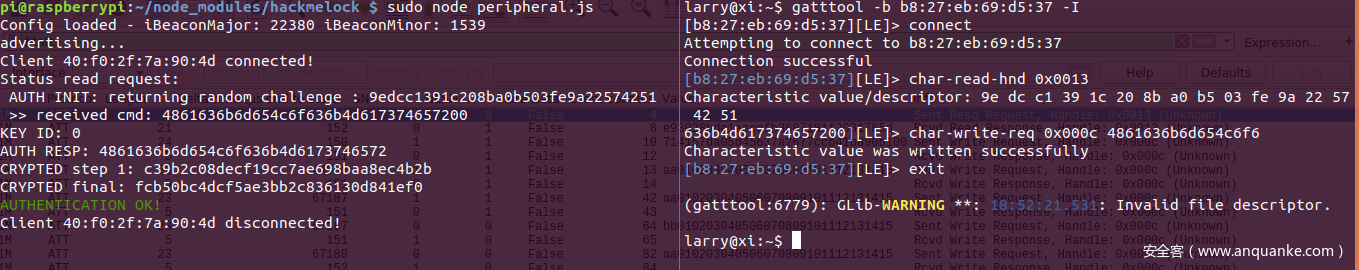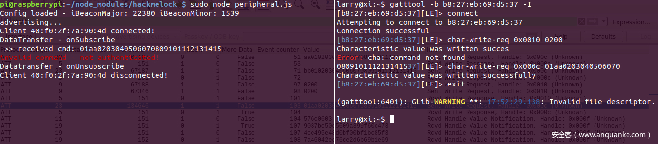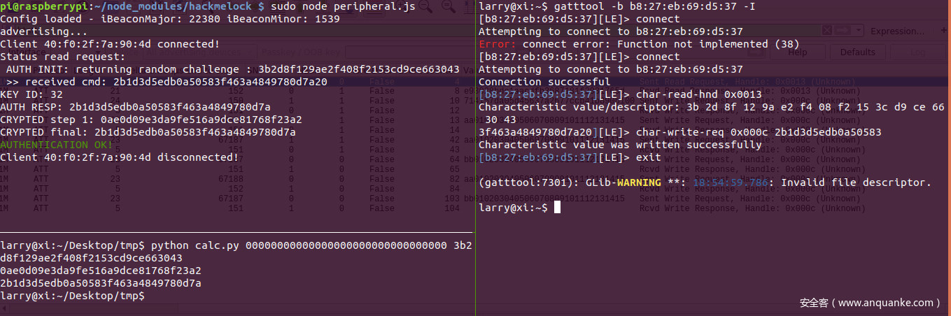 流程中比较感兴趣的就是内部实现的认证和数据重传部分,首先猜测不经过认证直接写入数据重传指令是否可以重置门锁,这里借助gatttool进行BLE的连接和请求: