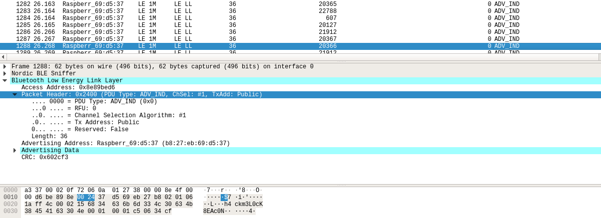 建立起虚拟门锁从设备后,其就在不停地广播。广播报文的类型有7种,用途比较广泛的类型是ADV_IND通用广播指示,广播报文的大致结构如下: