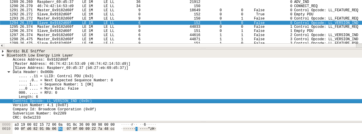 数据报文中的逻辑链路标识符LLID把数据报文分成三种类型,其中链路层控制报文(11)用于管理连接,如下的数据包便是在管理连接中的版本交换: