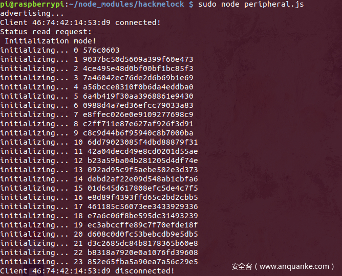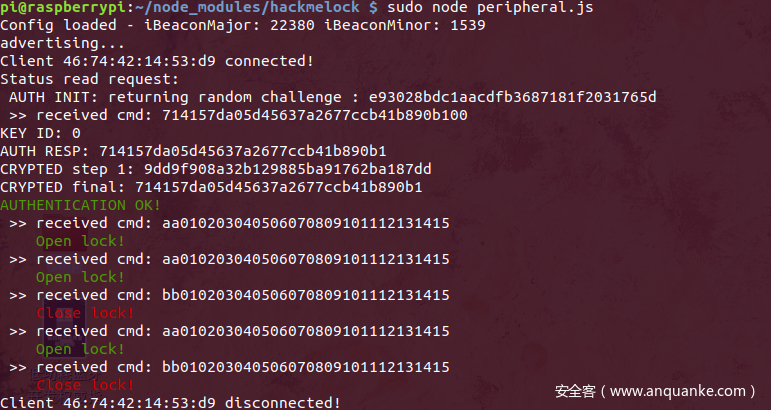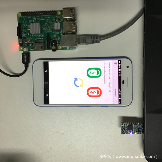 环境主从设备的选取是参考BLUETOOTH SMART HACKMELOCK提供的仿真环境,其在树莓派中用nodejs搭建了一个虚拟的BLE门锁,专门写了一个Android app来对这个门锁进行操作,两端都遗留了一些安全问题供我们后续探索学习。