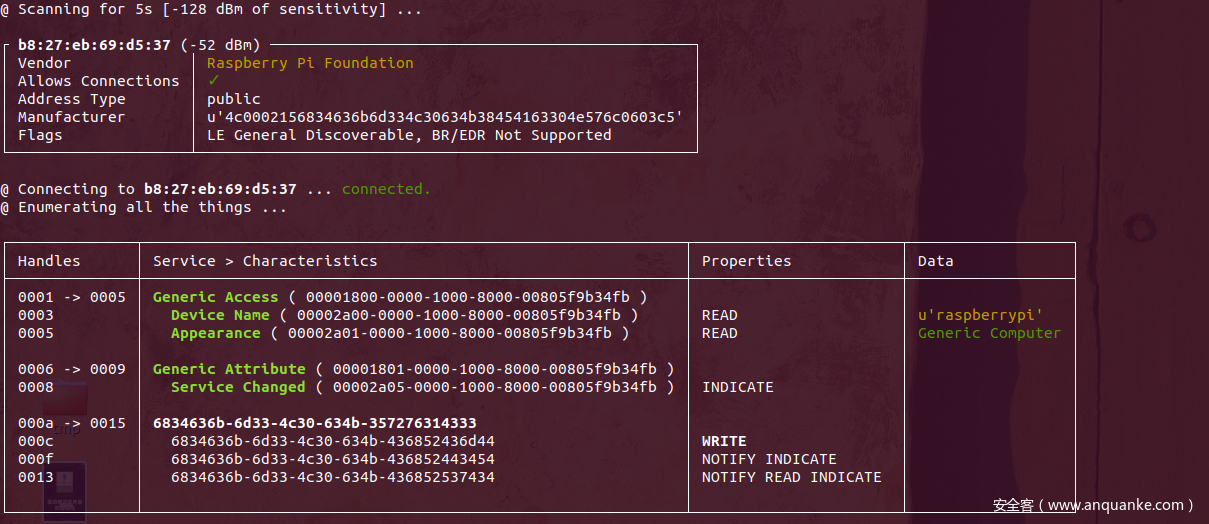 在数据包中分开看请求的服务和特性可能不是太方便,可以借助bleah直接枚举设备上的所以属性: