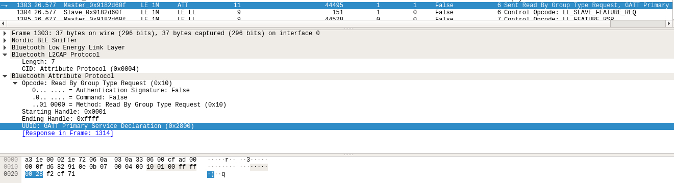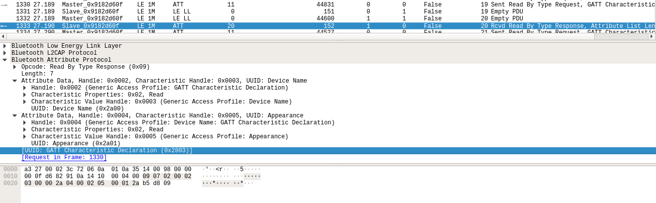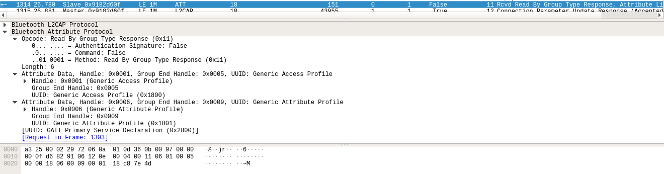 在低功耗蓝牙中特性是由一种或多种属性组成,服务是由一种或多种特性组成,并且是由服务声明来对服务进行分组,用特性声明来对特性进行分组。服务和特性的发现由通用属性规范规定,具体则表现为不同类型的属性协议,如下的数据包便是按组类型读取请求来读取首要服务声明:
