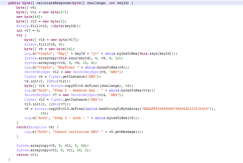 跟进去可知,根据不同的keyID对Challenge进行两次AES加密计算出响应: