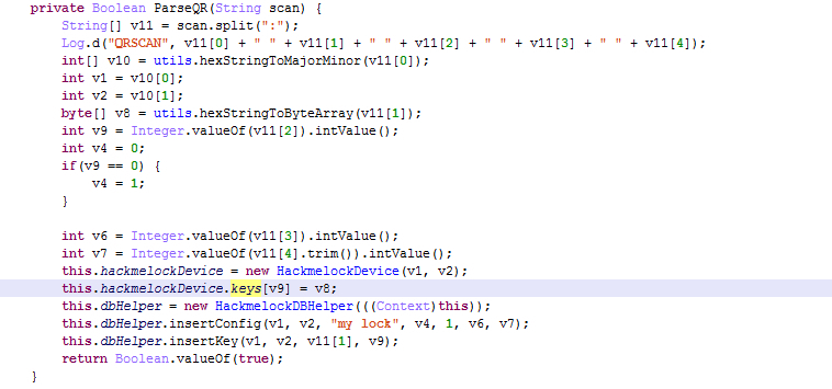 从App逆向的结果来看,二维码中会保存keyID为1的序列,有了任意的key就不存在权限和时间的限制了。如上的二维扫出的结果就是576C0603:4CE495E48D0BF00BF1BC85F3:1:1542885650:1542902400,与之前数据传输的记录相符: