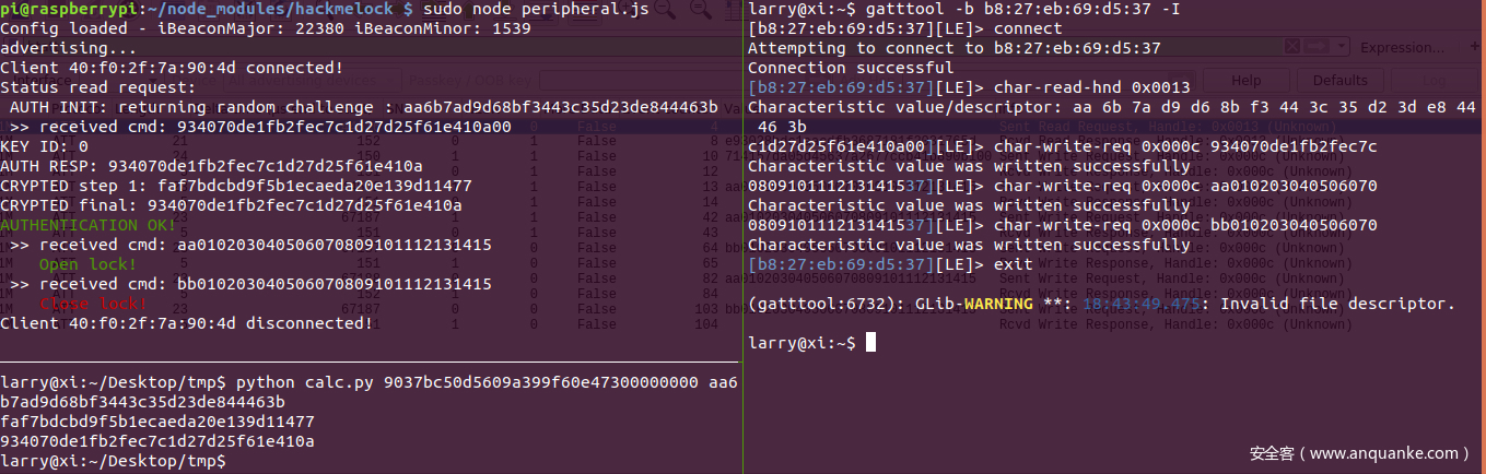 首先读取0x0013 handler读取一个random challenge,将响应写入0x000c handler,如果通过了认证则可以进行开关锁的操作,并且开关锁向handler中写入的值也是固定的: