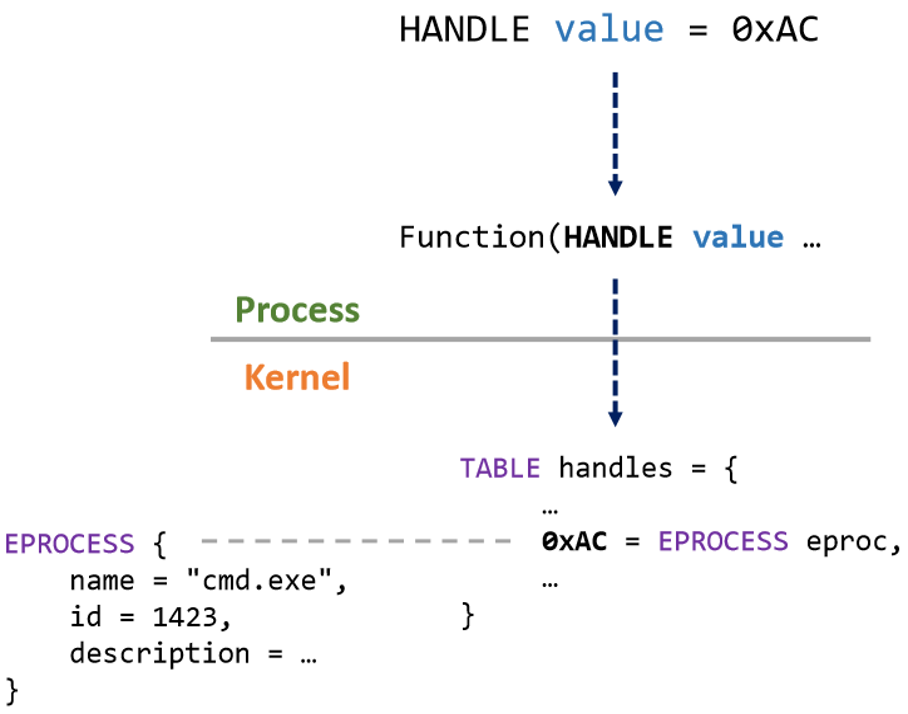 总的来说,句柄的工作为了指代内部结构,例如:令牌,进程,线程等。下图是一个句柄的示例。