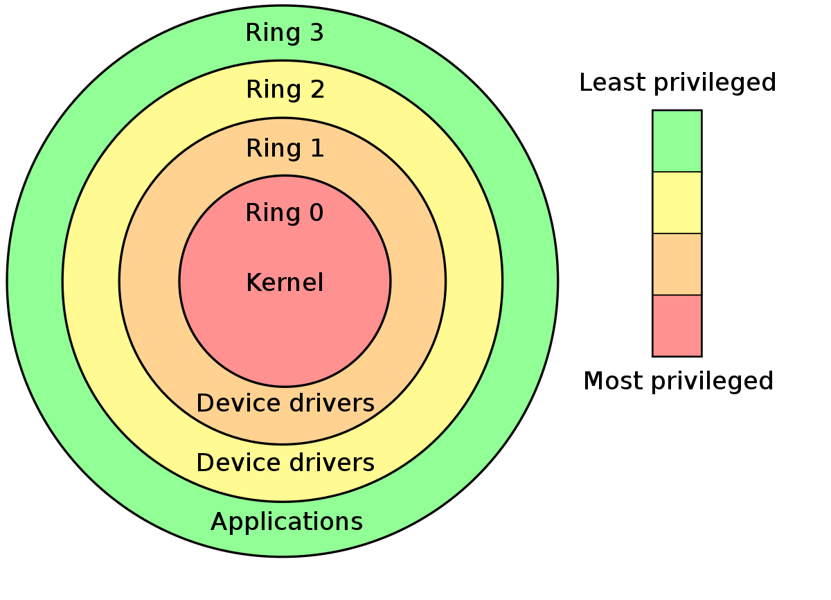 使用ring level特权模式的处理器定义了四个特权级别(rings)来保护系统代码和数据。下图是一个ring levels的示例。