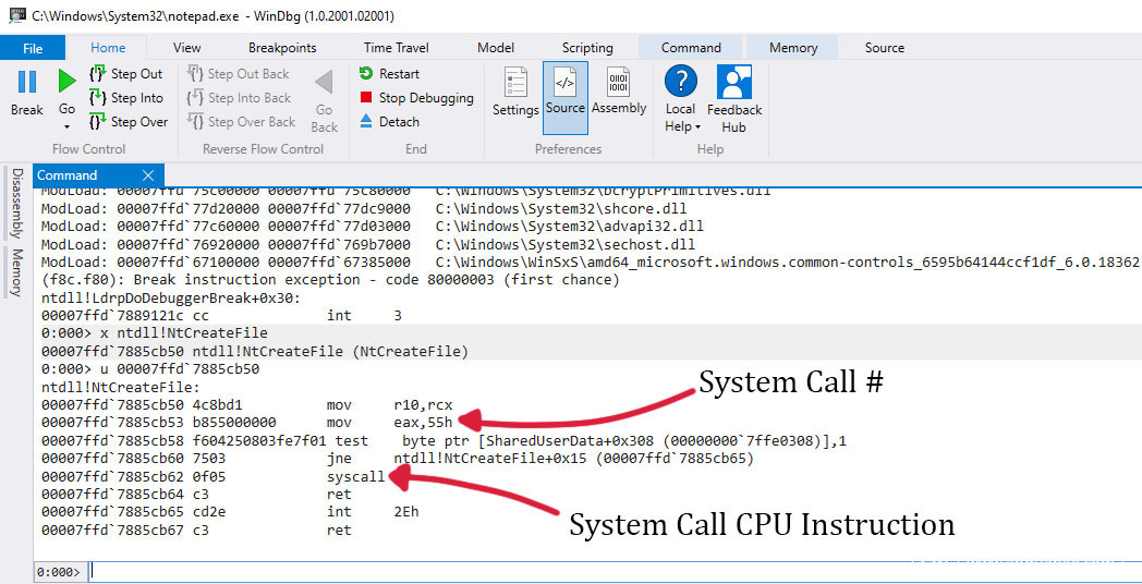 那么这个CPU指令syscall在ntdll中是什么样子的呢?我们可以使用WinDBG来反汇编并检查ntdll中的调用函数。