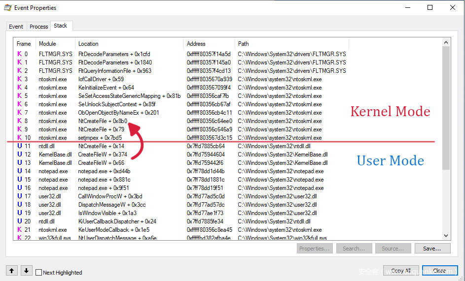 这种“转换”的例子可以在任何应用程序中观察到。比如说,如果使用Process Monitor观察Notepad程序,我们可以查看特定读/写操作的属性以及它们的调用堆栈。