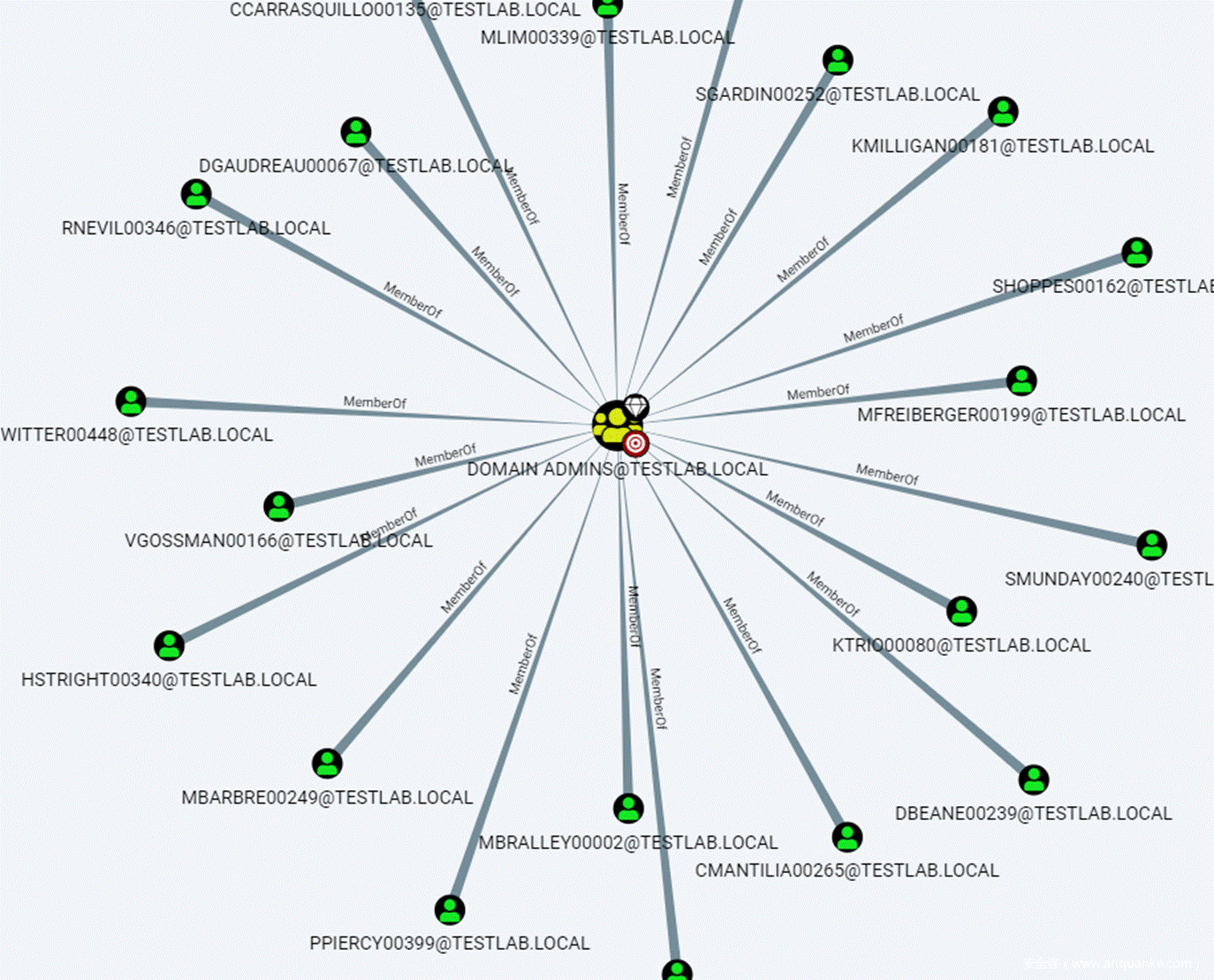 -MemberOf 此节点是上一节点的成员,由末端指向上的尖端,如图,所有的域管理员属于域管理员组。