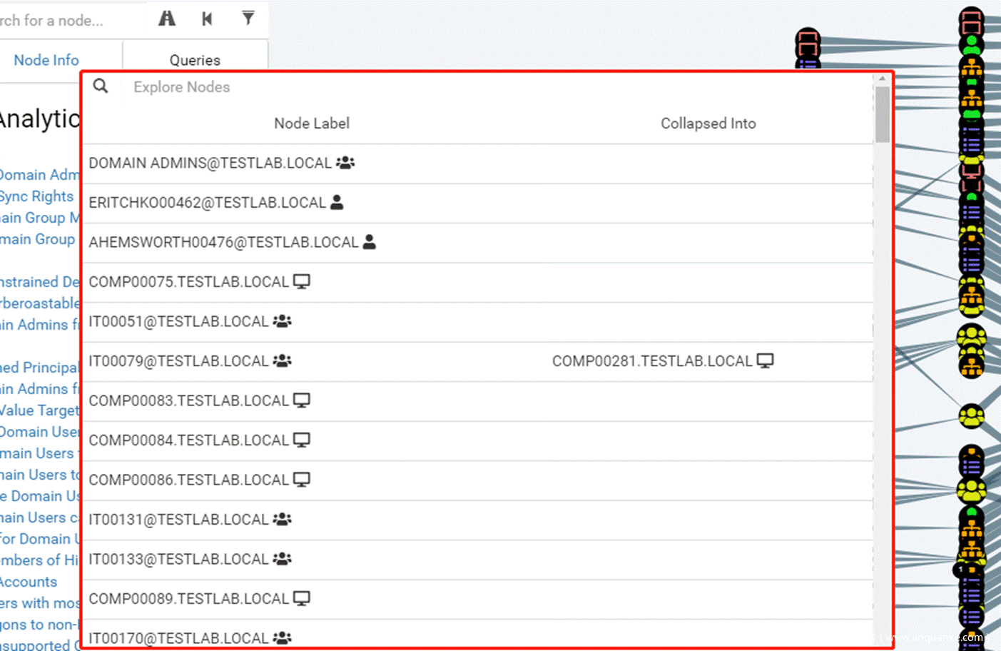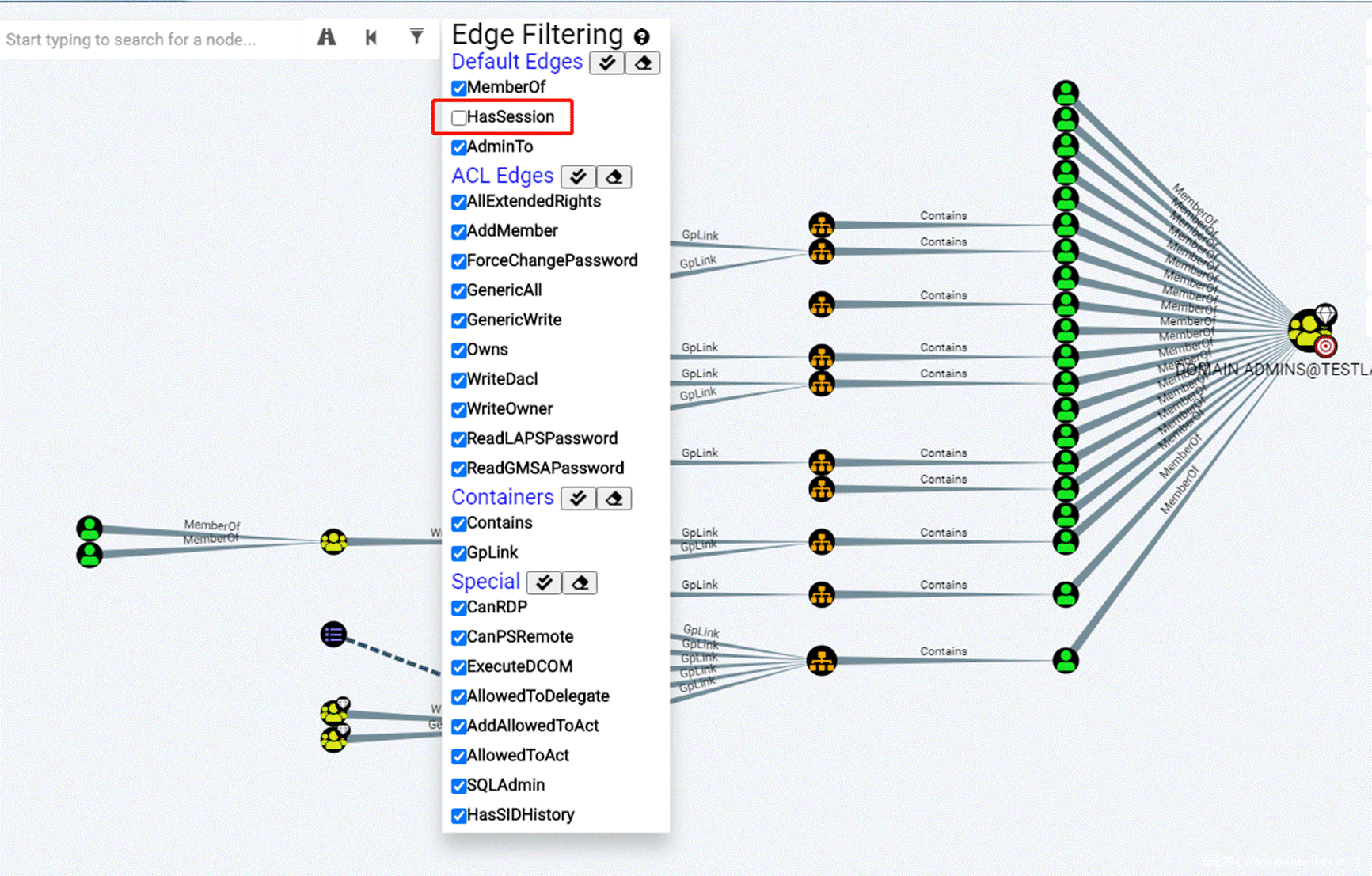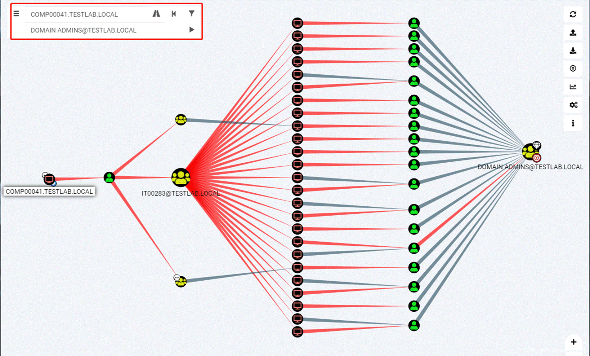 搜索 还有个高级用法,pathfinding路径搜索,这种搜索方式极为强悍,直接搜索该节点到目标节点路径,假设我们拿下了COMP00041.TESTLAB.LOCAL ,想要知道该节点到达高价值目标DOMAIN ADMINS@TESTLAB.LOCAL 的路径,用下面的方式搜索,会自动规划好一条到达目标的最短路线。