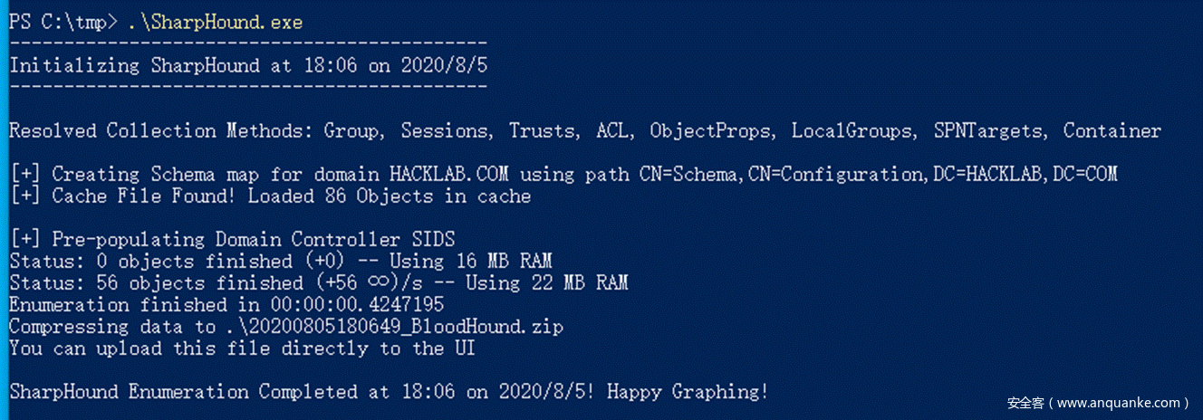 按照默认的方式收集Container, Group, LocalGroup, GPOLocalGroup,Session, LoggedOn, ObjectProps, ACL, ComputerOnly, Trusts, Default, RDP, DCOM, DCOnly 的数据,也可以用 -c 参数指定要收集的数据类型,如 -c Session,RDP,ACL