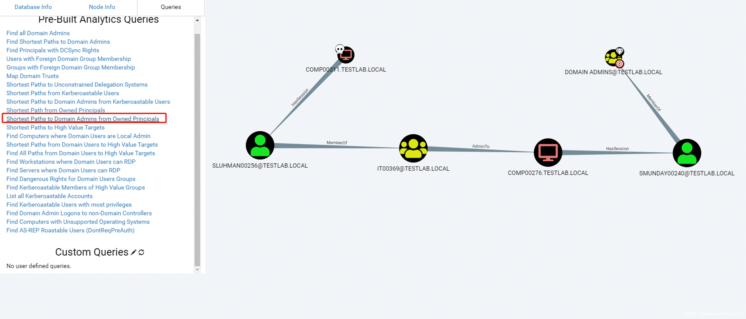 假设我们已经控制了COMP00311.TESTLAB.LOCAL,目标节点则是DOMAIN ADMINS@TESTLAB.LOCAL,使用预定义的查询语句Shortest Paths to Domain Admins from Owned Principals,查找从已拥有的主体到域管理员的最短路径
