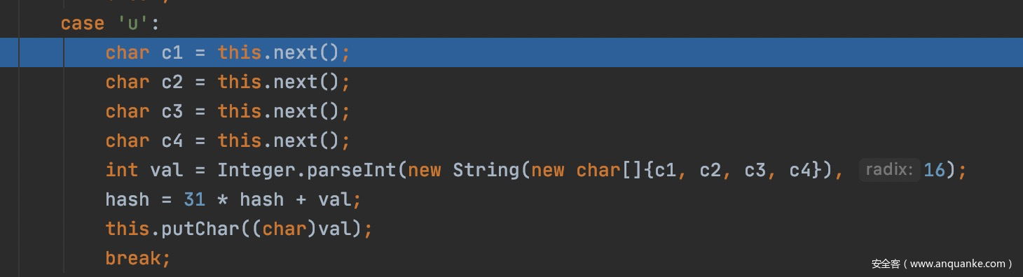 在fastjson在进行json字符的处理时,如果扫描到 ‘/‘ (代码里是//是因为java自身的特殊字符编码),fastjson会认为字符经过了编码,所以会进行解码操作。在代码的case when场景中,绝大多数场景都是形如\f、\n这一类特殊字符,fastjson自然也就做的处理也很简单,这里重点看两个case,