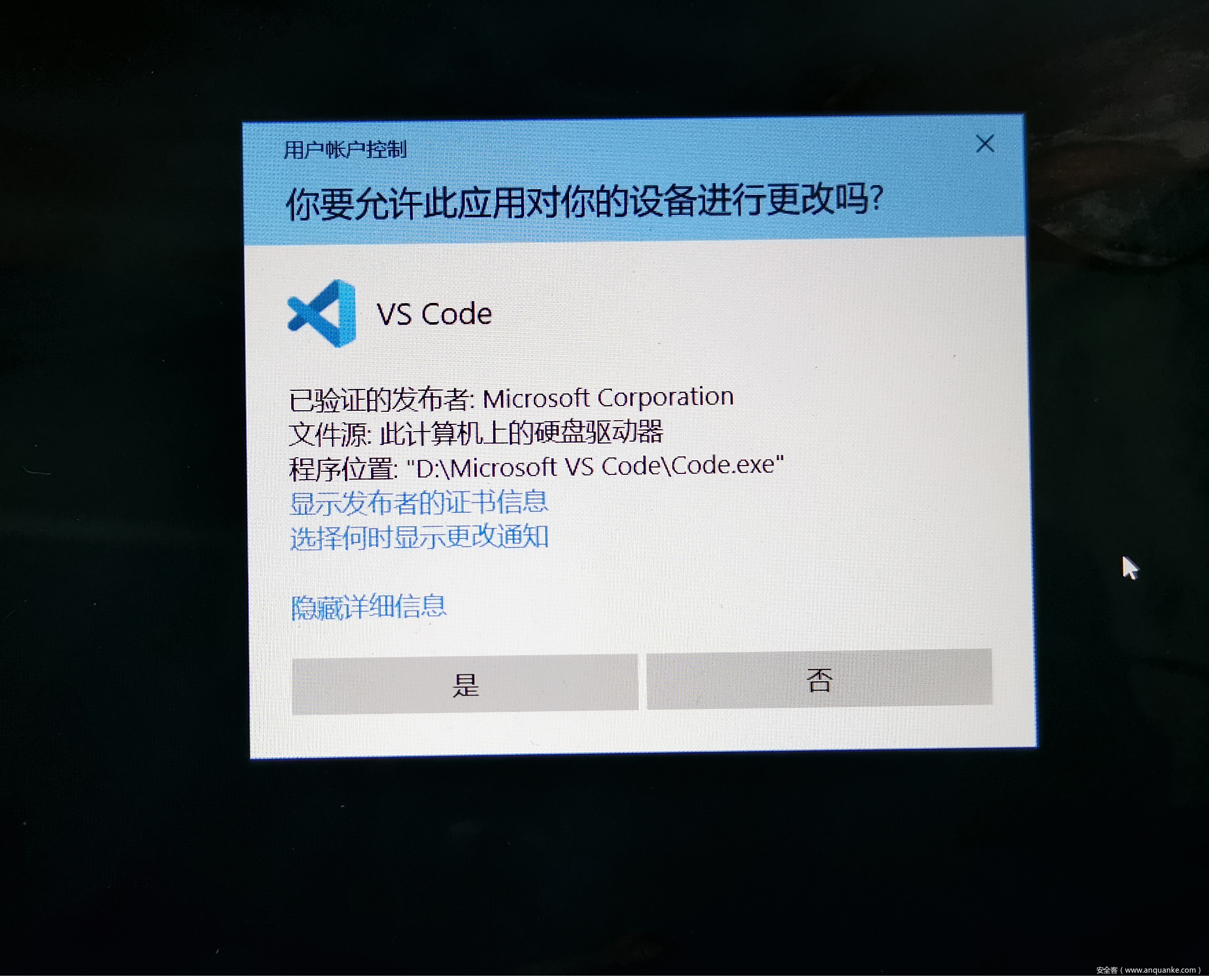 原来如此,传进去的是待创建的进程的全路径。而consent进程画出来的那个窗口的全路径信息也是来自于此,如下:【原谅我没有双屏,只能手机拍照了。】