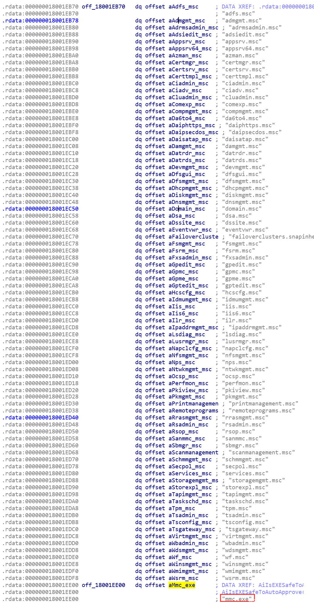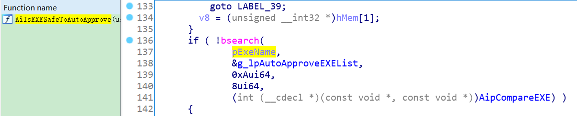 具体的代码如下,g_lpAutoApproveEXEList这个全局变量以及AipCompareEXE这个函数值得我们重点关注下,在具体解析前,先来看下bsearch的参数。