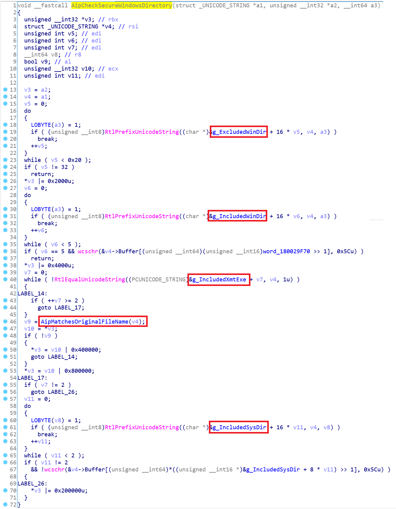 再来看下AipCheckSecureWindowsDirectory()的内部实现,很精彩。