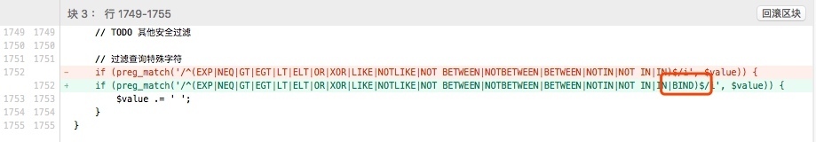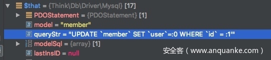 这里由于拼接了$val参数的形式造成了注入,但是这里的bind表达式会引入:符号参数绑定的形式去拼接数据,通过白盒对几处CURD操作函数进行分析定位到update函数,insert函数会造成sql注入,于是回到上面的updateh函数。