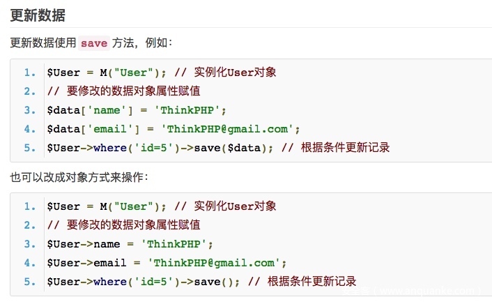 一般按照官方的写法,thinkphp提供了数据库链式操作,其中包含连贯操作和curd操作,在进行数据库CURD操作去更新数据的时候: