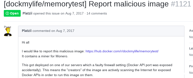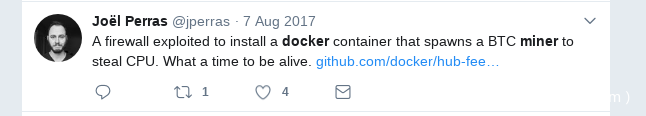 容器运行嵌入式加密货币矿工。 (在容器运行的情况下,它将下载恶意的.jpg文件,该文件在bash中运行并公开挖掘软件。) |