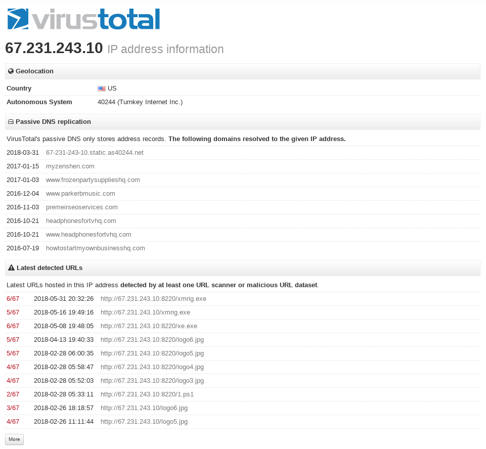 一个简单的查找(例如67.231.243.10)显示IP被用于处理恶意软件,包括: