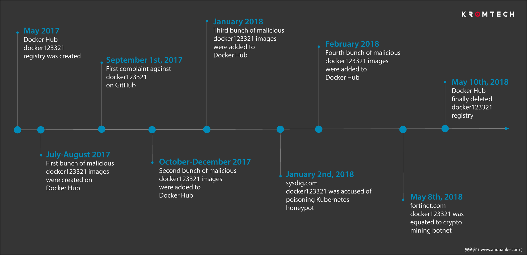 Kromtech安全中心发现了17个存储在Docker Hub整整一年的恶意docker镜像。即使在sysdig.com和fortinet.com通过GitHub和Twitter进行了多次投诉之后,网络犯罪分子仍在Docker Hub上继续扩大他们的恶意软件武器库。由于拥有超过500万的吸引力,docker123321私人镜像库被认为是一个用于加密容器的跳板。如今,像Kubernetes这样的可公开访问、配置不当的编排平台越来越多,这让黑客能够创建一个完全自动化的工具,迫使这些平台挖掘门罗币。通过将恶意镜像推送到Docker Hub镜像库,并将其从受害者的系统中提取出来,黑客能够挖掘544.74枚门罗币,相当于90000美元。