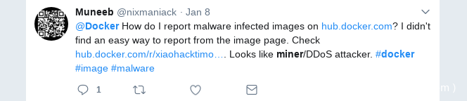 图3.Twitter用户抱怨说,在Docker Hub上没有便捷的方式报告恶意软件