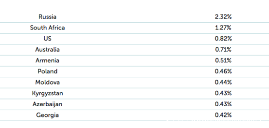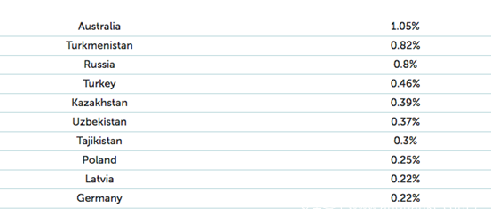 去年,俄罗斯已经超过德国,印度也超过中国,成为第三名。总的来说,排名大致是稳定的,排名靠前的用户约占五分之一份额,而“其他”用户约占40%的份额。