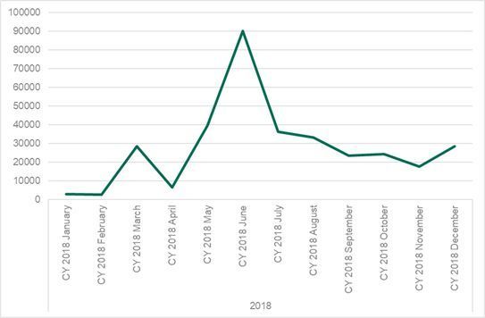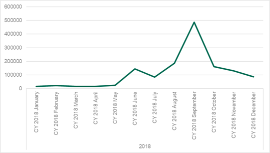 2018年4月,受攻击用户数量开始迅速上升,总人数达到1799891人,这意味着在短短一年内,该数字增长了两倍多。可以看出,这主要是由于4月至6月和7月至9月期间出现了两个高峰。