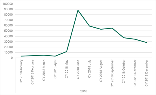 然而,2018年5月至11月的大幅增长改变了这一格局,重新平衡了下降趋势,与去年相比总体增长15.95%,达到889,452人。这是自2016年以来首次出现同比增长。这是由于RTM银行木马家族的爆炸性增长,分析如下。